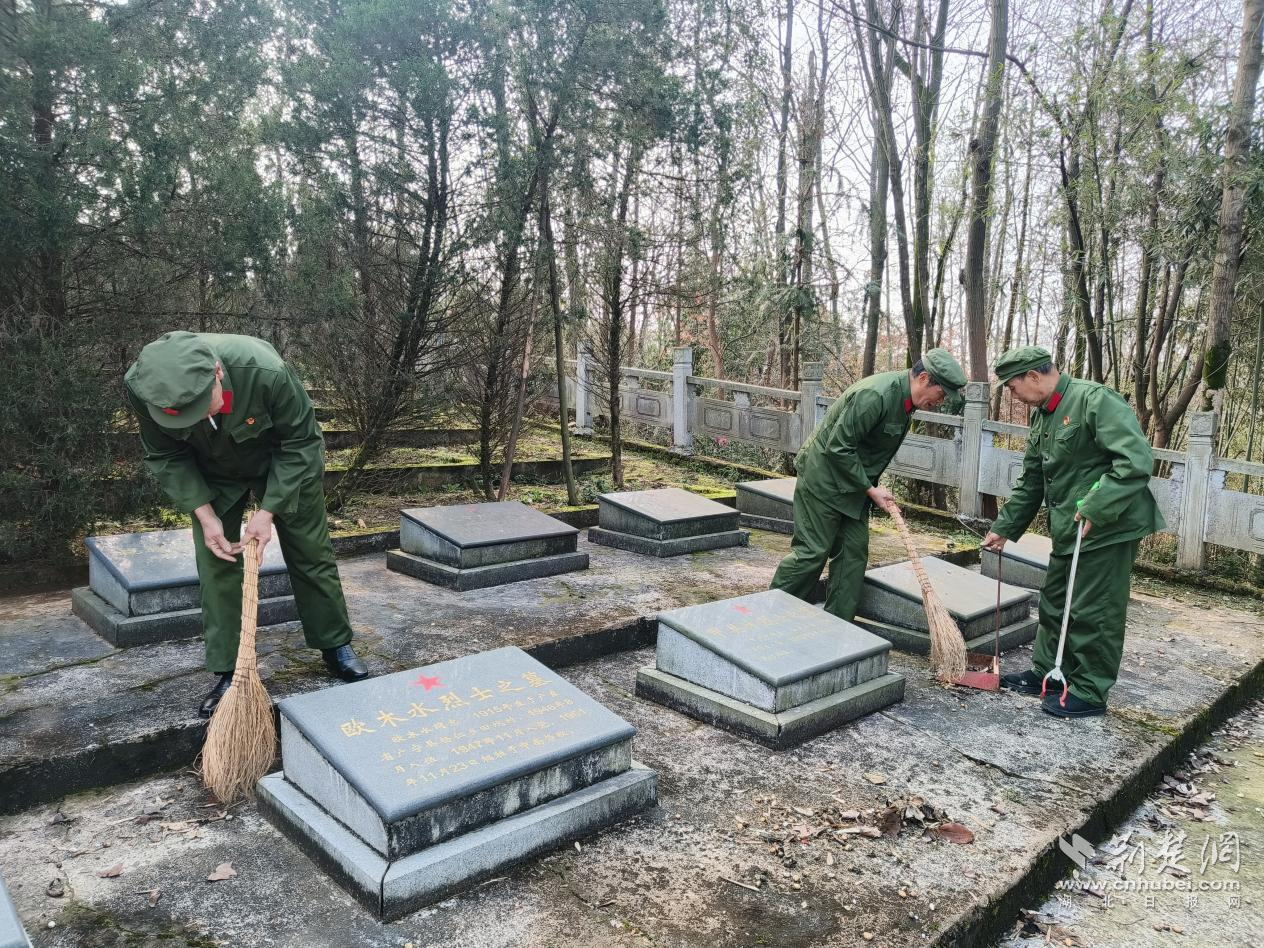 烈士陵园松柏苍翠、庄严肃穆。咸安区退役军人事务局工作人员与身着绿军装的老兵志愿者整齐列队。大家分工协作,清扫落叶、拔除杂草、擦拭墓碑、清理排水沟,让烈士墓区环境更加整洁肃穆。