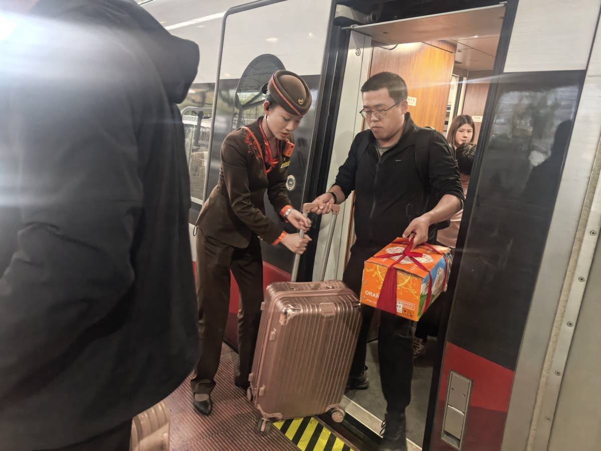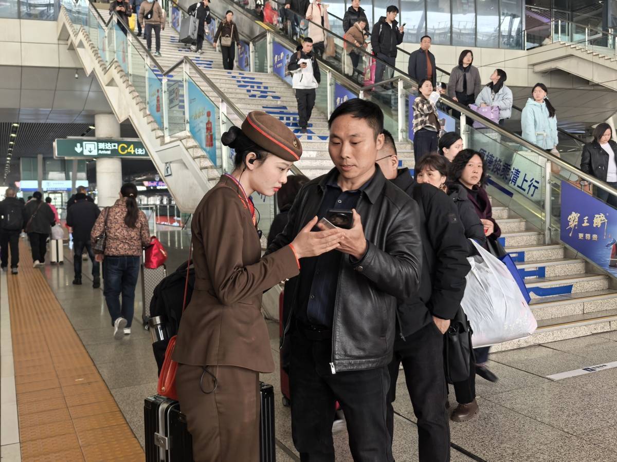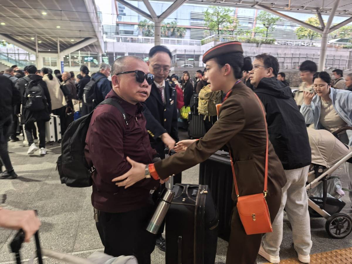 3月5日,武汉开往深圳北的G2707次列车上,武汉客运段南线动车组车间的乘务人员开展暖心志愿服务,用实际行动诠释新时代铁路人的责任与担当。在站台,乘务员主动帮扶老年旅客、携带大件行李的旅客平稳通过扶梯,耐心解答旅客问询,细致指导旅客手机购票、换乘查询等操作。车厢内,乘务员逐一整理行李架,确保行李摆放平稳,消除行车安全隐患;同时重点关注行动不便的旅客,全程协助轮椅旅客、盲人旅客上下车,从站台引导、车厢帮扶到座位安置,每一个环节都细致周到,让特殊旅客出行无忧。“列车员就像家人一样,全程牵着我的手,帮我找座位、拿行李,太贴心了!”一位盲人旅客在下车时由衷点赞。(湖北日报通讯员 周赟玥 潘婷 摄)