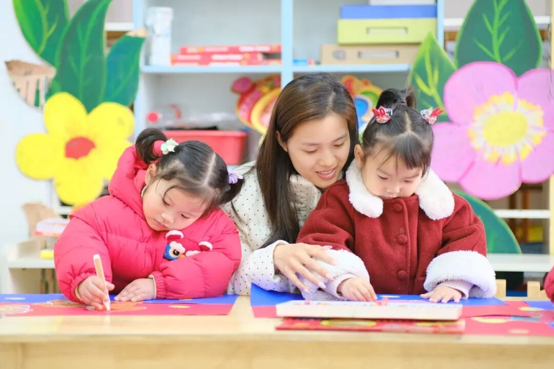 在江西赣州市会昌县总工会定点托育机构内,老师正陪伴孩子们画画。吕春华摄