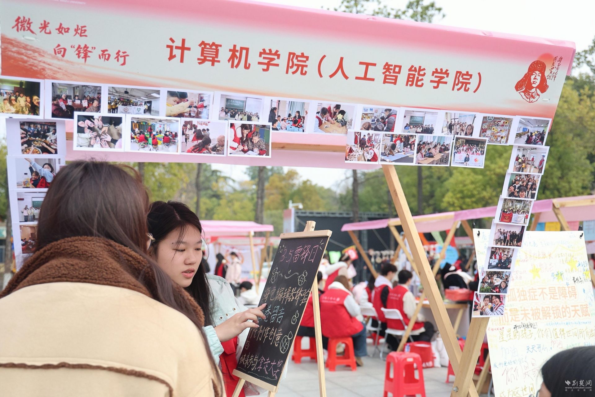 旁边展位上,计算机学院“e如既往”项目组志愿者喻清雯正蹲在笔记本电脑前,向围拢的小学生演示编程积木块的操作。屏幕上,彩色指令模块拖动拼接,一只小猫图案随之跳动。孩子们发出惊叹声。自2019年成立以来,这支队伍立足计算机专业优势,从校内课堂逐步拓展至武汉市多个社区、中小学,以海龟编辑器为载体,将编程知识转化为趣味化积木式教学,同时将服务延伸至科普实验、老年人智能手机培训等场景。“用专业所学做公益,既能帮到孩子们,也让我们自己在实践中完成了成长与蜕变。”喻清雯说。这支队伍已连续多年获评校级优秀志愿服务团队。