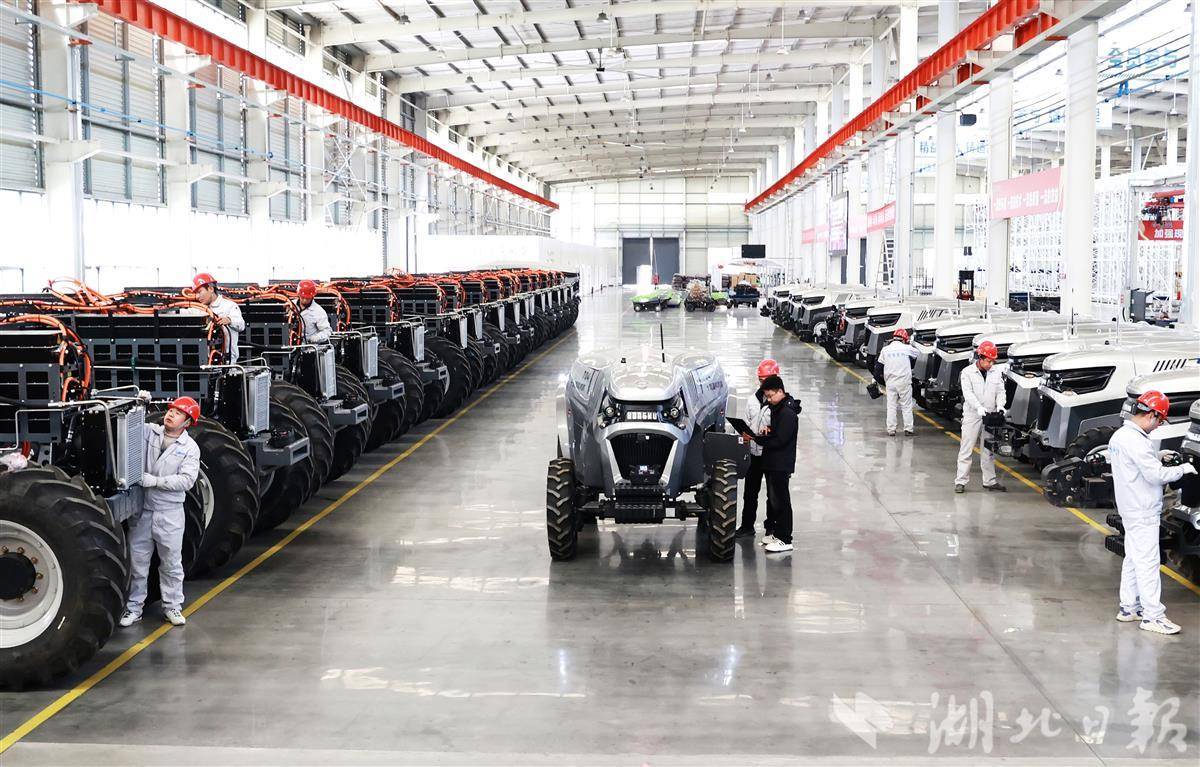 3月5日,在十堰郧阳区的十堰国科鸿鹄科技有限公司智慧农机生产线上,工人正在加紧组装智慧农机。