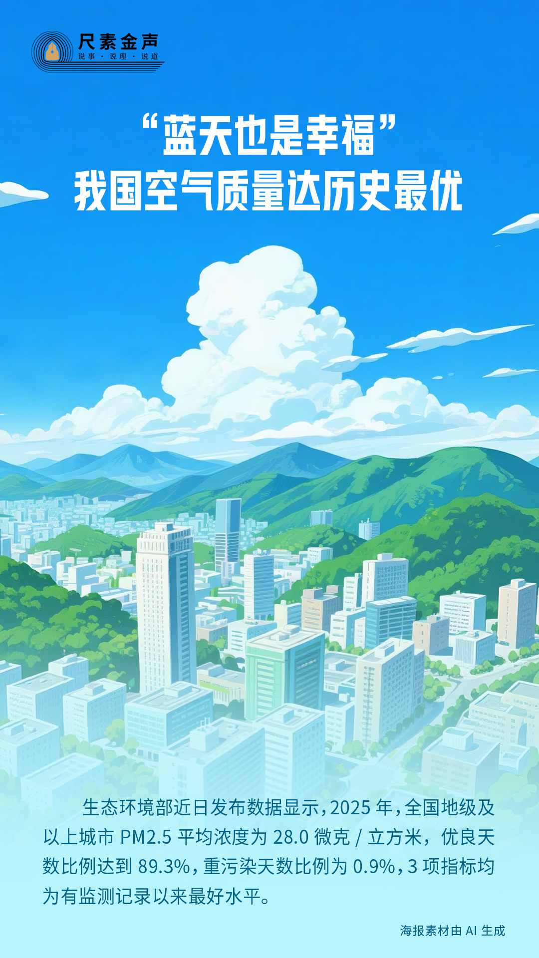 生态环境部近日发布数据显示,2025年,全国地级及以上城市PM2.5平均浓度为28.0微克/立方米,优良天数比例达到89.3%,重污染天数比例为0.9%,3项指标均为有监测记录以来最好水平。
