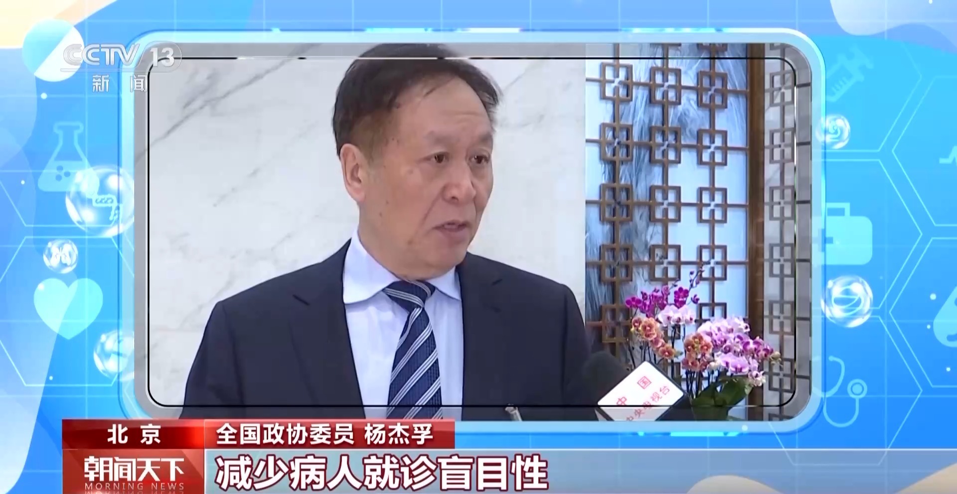 全国政协委员 杨杰孚:首先在院前甚至院内应该辅导病人的诊疗,因为病人很多不知道看谁看哪个科,我们通过人工智能简单询问,尤其是把电子病历开了,我们的智慧医疗辅导病人看科室看专家,减少病人就诊盲目性。
