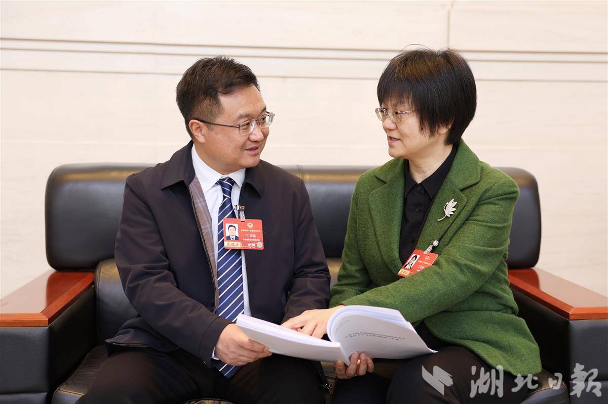 全国政协委员丁华锋(左)与丁亚琳讨论“十五五”规划纲要草案。