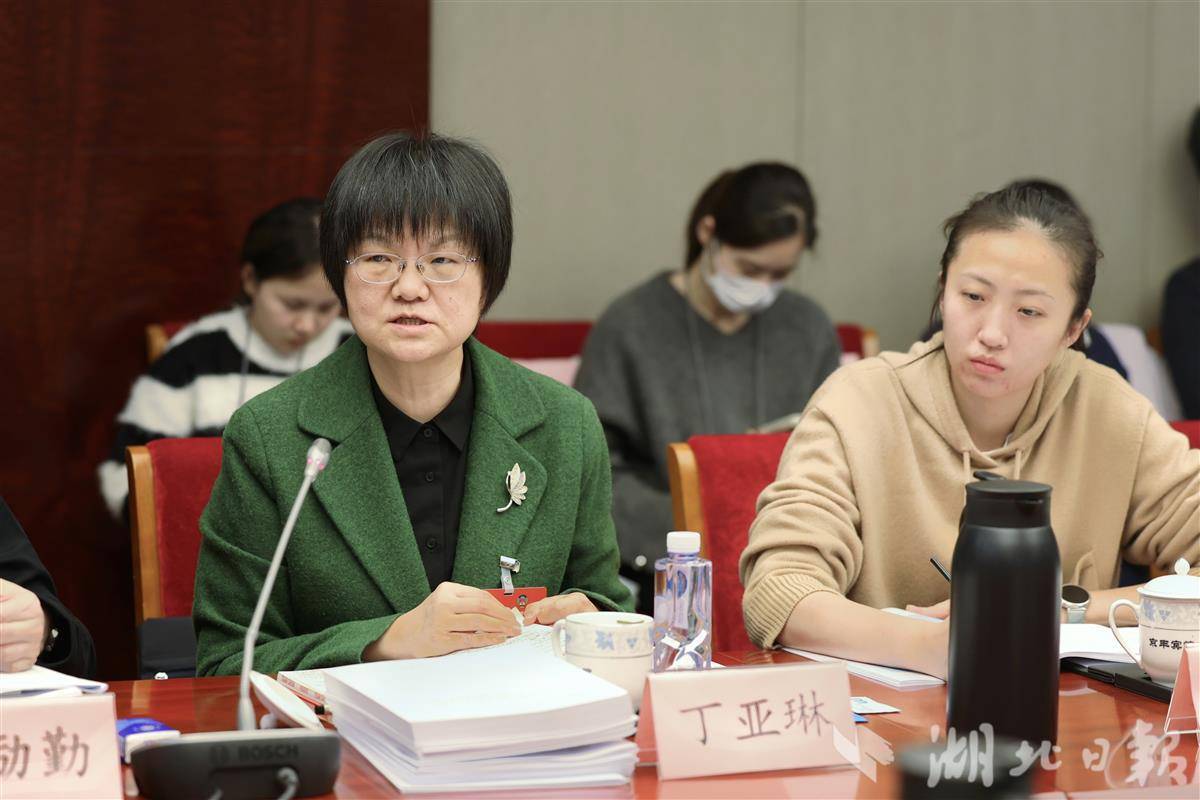 全国政协委员丁亚琳(左)在小组会议上发言。