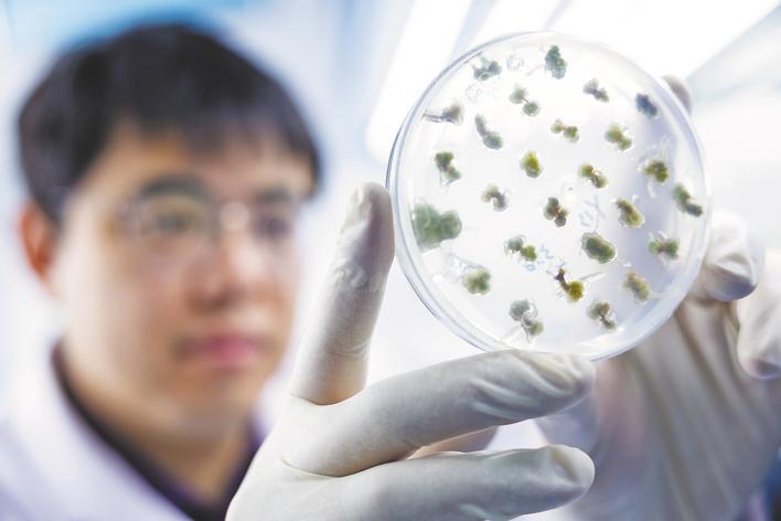 中国农科院油料所科研助理张亮观察油菜愈伤组织生长情况。 (湖北日报全媒记者 任勇 通讯员 张杨 张惠雯 摄)