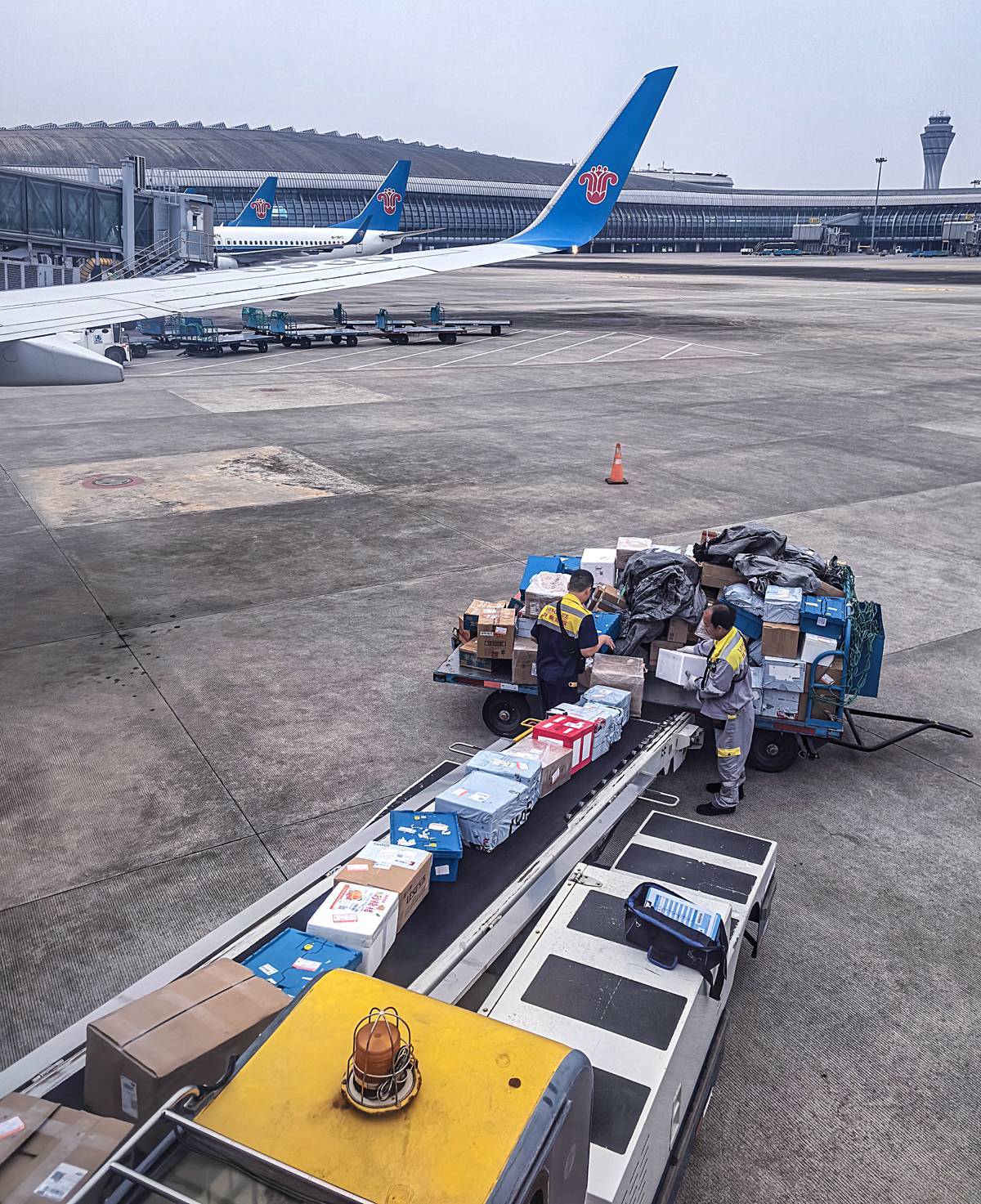 3月7日7时许,南宁吴圩机场的工作人员给客机装货物。