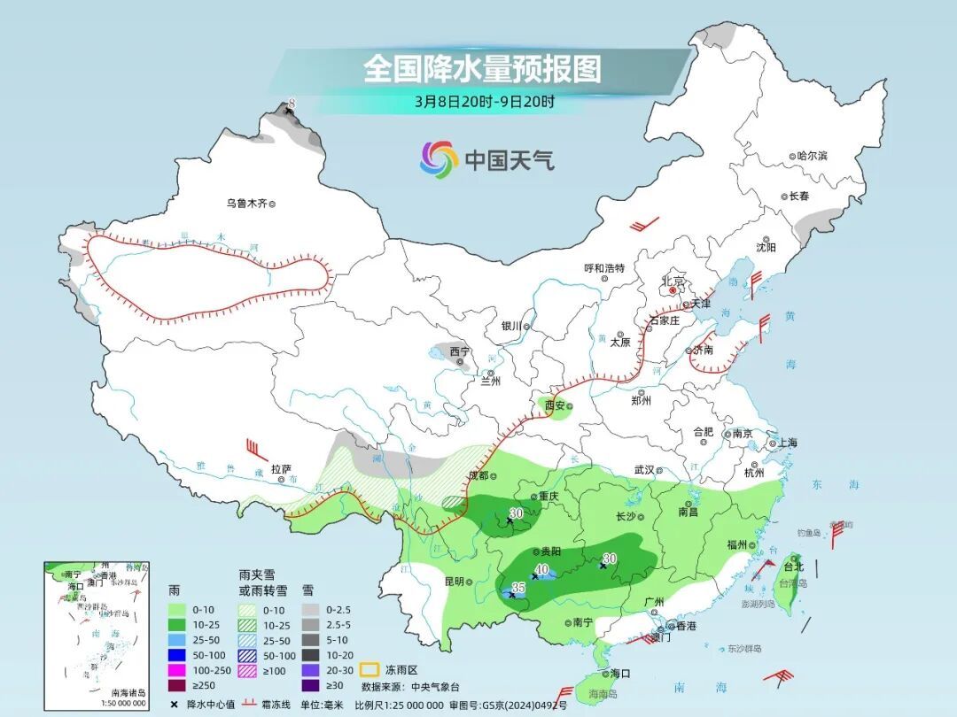预计西北地区东部、华北西部和北部、内蒙古、东北地区等地有小到中雪或雨夹雪,局地有大到暴雪;西南地区东部、江汉、黄淮、江淮、江南西部及西藏东南部等地有小到中雨,局地大雨。