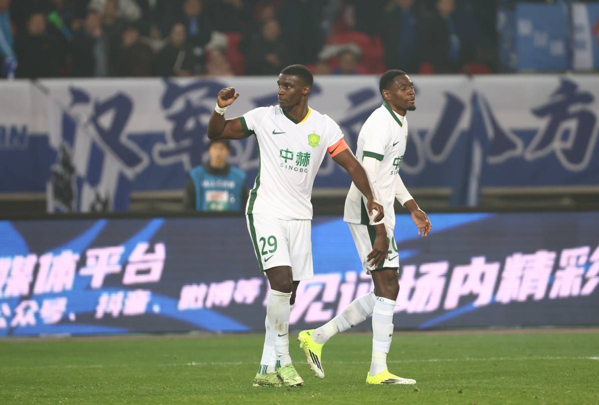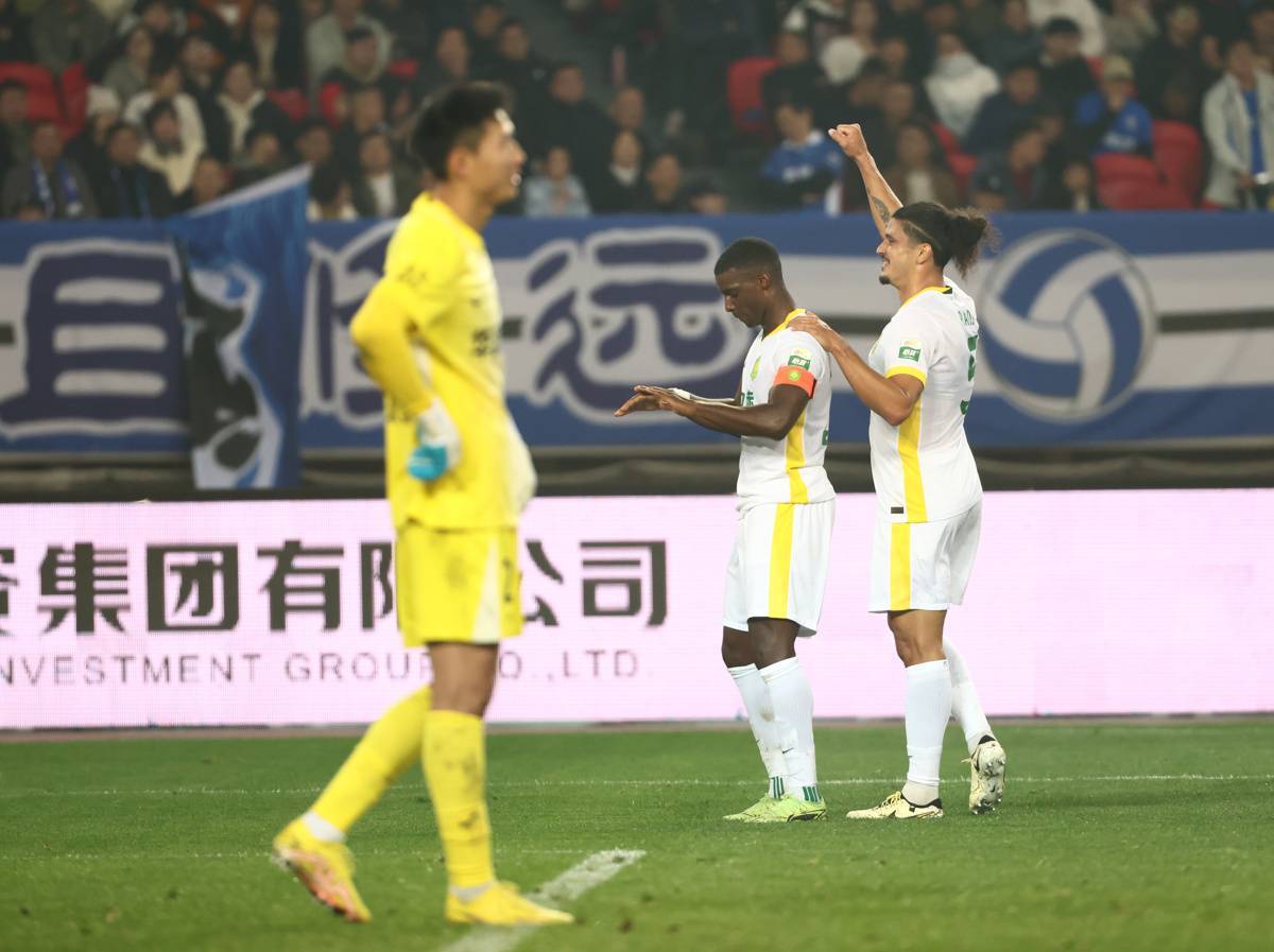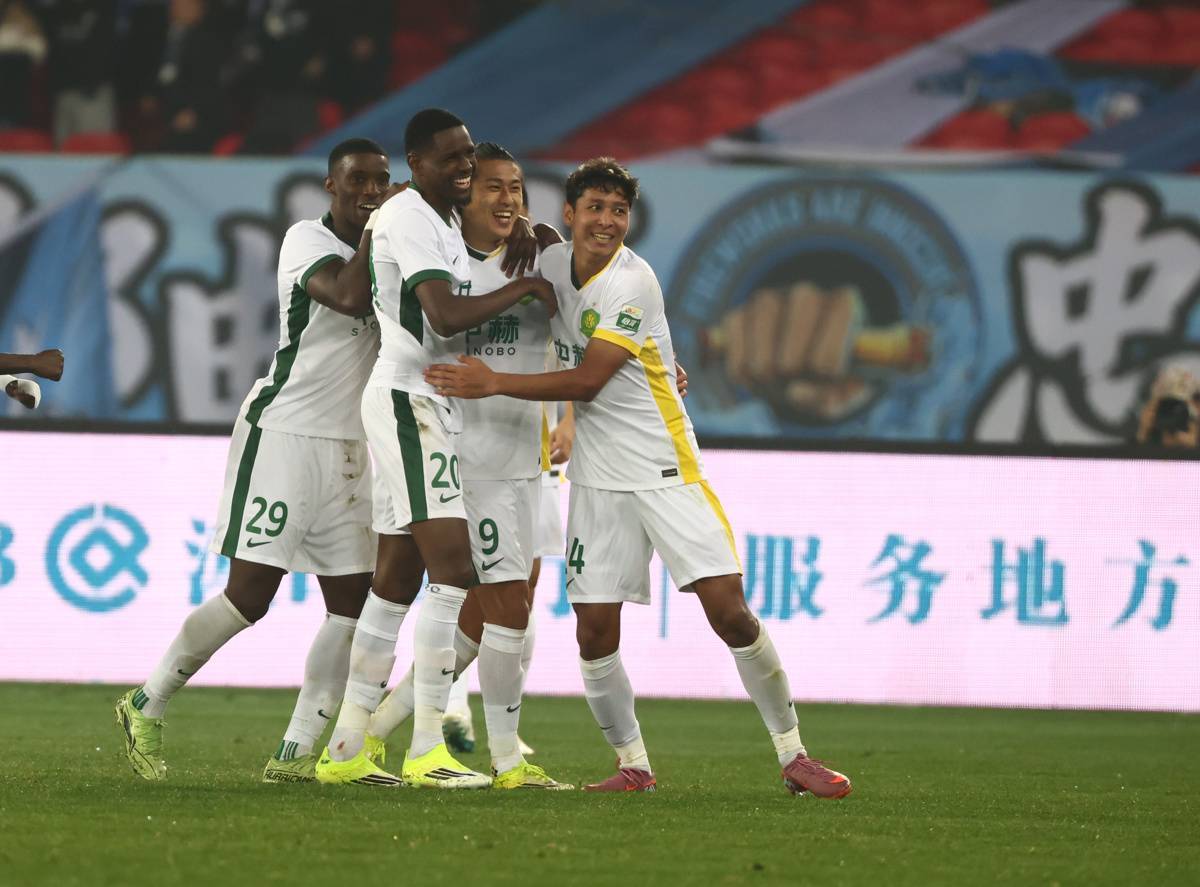 北京国安队庆祝进球。(湖北日报全媒记者 柯皓 摄)