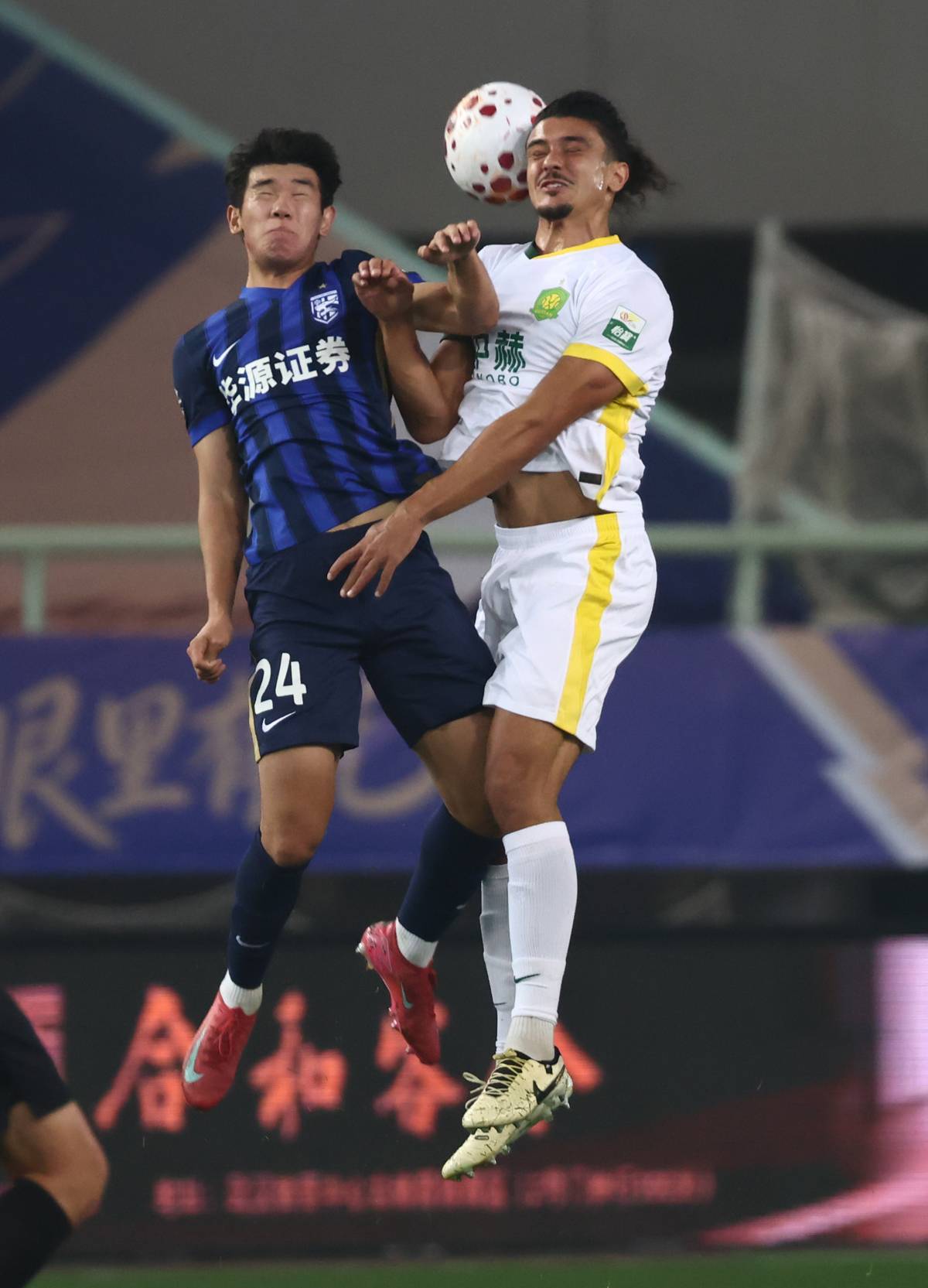 武汉三镇队球员姜利勋(左)在比赛中拼抢。(湖北日报全媒记者 柯皓 摄)