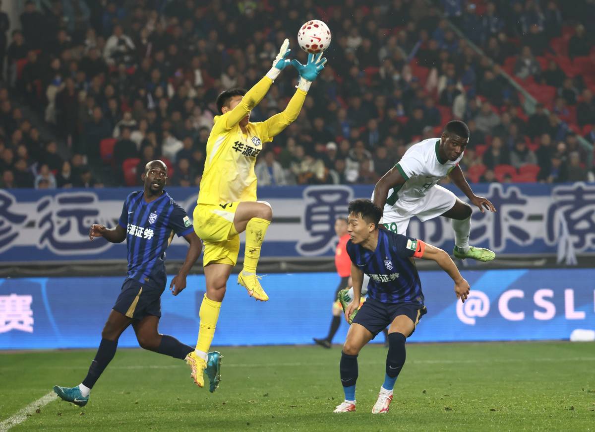 武汉三镇队守门员没收皮球。(湖北日报全媒记者 柯皓 摄)