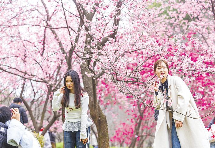 武汉东湖磨山景区早樱绽放,游客漫步花间,尽享春日浪漫。 (湖北日报全媒记者 薛婷 摄)