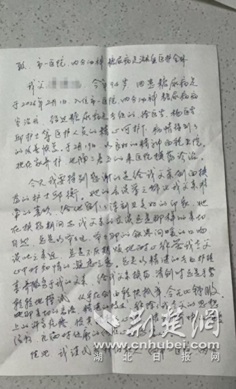 荆楚网(湖北日报网)讯(通讯员 毛江华) 3月3日,襄阳市第一人民医院内分泌二病区邱衡护士收到一封特殊的感谢信。泛黄的信纸上,94岁患者黄爷爷的家属用饱含深情的笔触,写下了对糖尿病慢性创面小组由衷的谢意。