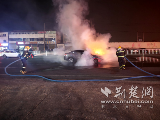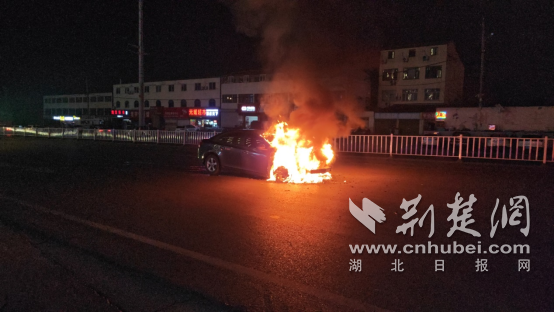 当日20时53分,荆门市消防救援局指挥中心接到群众报警,称掇刀区迎春转盘路口有一辆小轿车起火。指挥中心立即调派荆东大道消防救援站2辆消防车、8名消防救援人员,携带5G布控球等通信装备赶赴现场。
