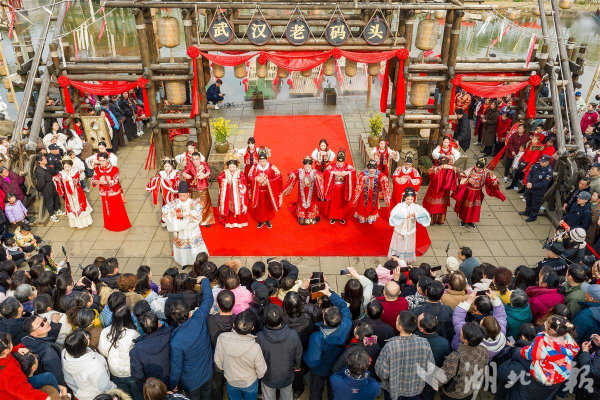 湖北日报讯(记者杨文漪、通讯员张雅迪)3月8日,武汉江夏里老码头文化美食街区被一片绛红淹没,一场别开生面的“六合同心·汉韵良缘”集体汉婚盛典浪漫启幕。六对分别出生于50后至00后的夫妻,身着华美婚服,在亲友和游客的见证下,重现传统汉婚礼仪,上演跨越半个世纪的爱情故事。