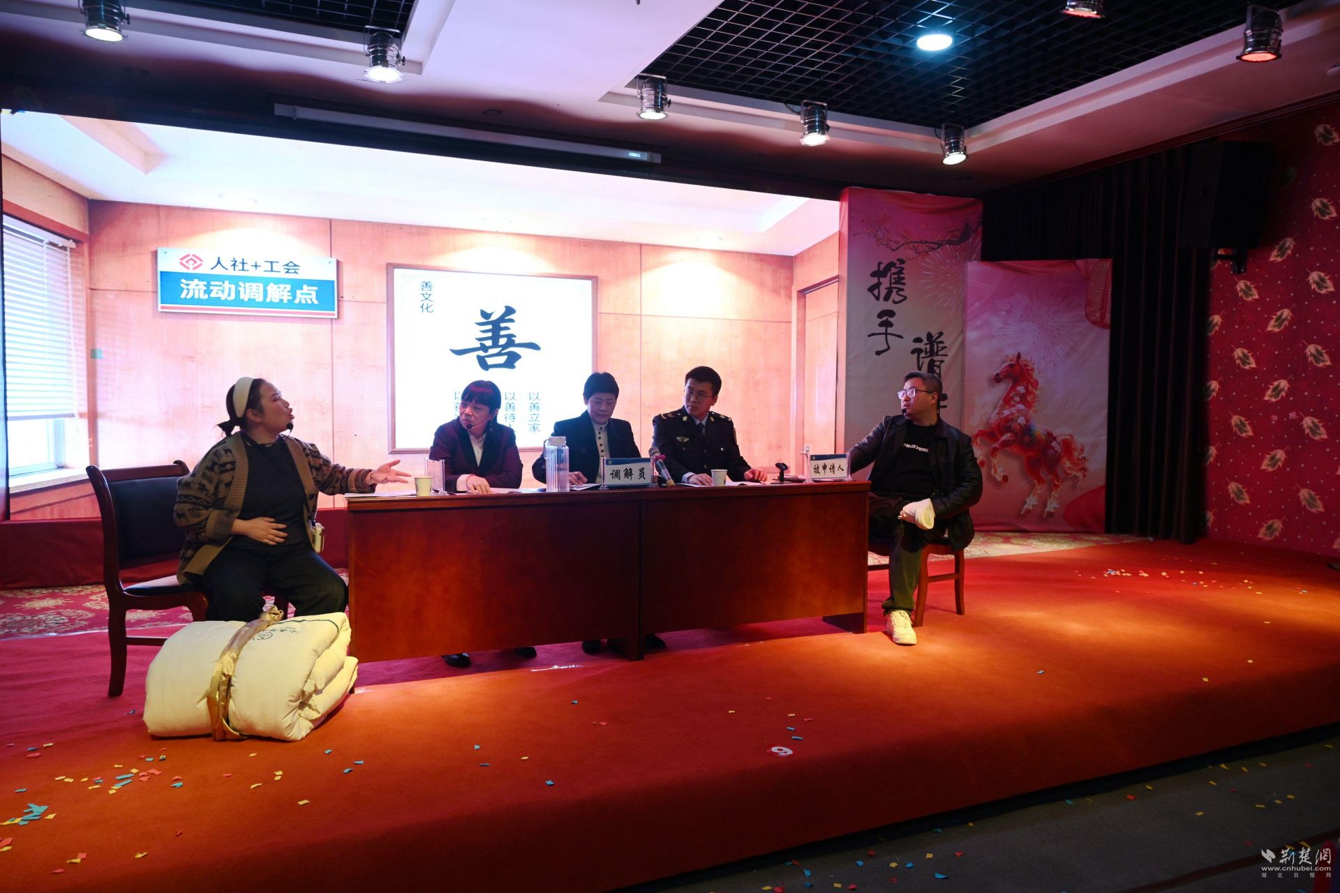《人社+工会》情景剧。以善文化为背景,一张桌子,几把椅子,茶水为场景。还原某企业销售主管唐某,怀孕4个月,公司以唐某身孕,“不适合”跑外勤为由,劝其解除劳动合同。唐某与企业评理无果,到县“人社+工会”裁调工作室申请维权。了解案情后,“人社+工会”裁调室,以流动调解方式,到某企业围绕《女职工劳动保护特别规定》相关法律,释案说法,细心调解,对唐某孕期岗位风险评估。