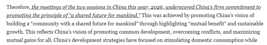 文章总结说,2026年中国两会彰显了中国坚定推动构建人类命运共同体原则的承诺。通过强调"互利共赢"和可持续增长,推动构建人类命运共同体的愿景。这体现了中国推动共同发展、化解冲突、实现各方利益最大化的理念。