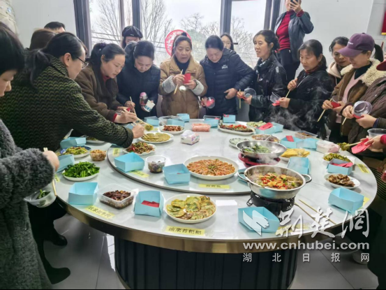 在趣味烹饪评比环节,大家纷纷端来自备的拿手菜,油菜苔炒鸡蛋、清蒸鳊鱼、面煎鱼、洋葱蒸蛋、特色捆蹄……色香味俱全的菜肴摆满长桌,令人垂涎欲滴。由现场姐妹们组成的“大众评审团”手持选票,逐一品尝、认真打分,在“参赛菜品统票”环节,大家紧盯票数变化,为各自支持的“厨神”加油鼓劲。现场香气四溢、欢声笑语不断,大家边品尝边交流烹饪心得,在烟火气中拉近了彼此距离,也展现了姐妹们“上得厅堂、下得厨房”的多才多艺。