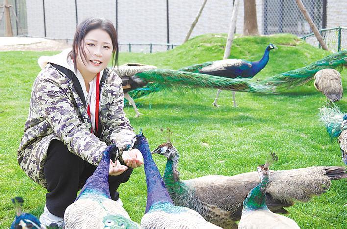 吴蓓在园区饲养蓝孔雀。
