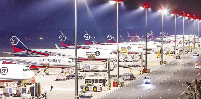 凌晨,鄂州花湖国际机场停机坪,全货机依次排开,运输货物的拖车穿梭往来。(湖北日报全媒记者 薛婷 摄)