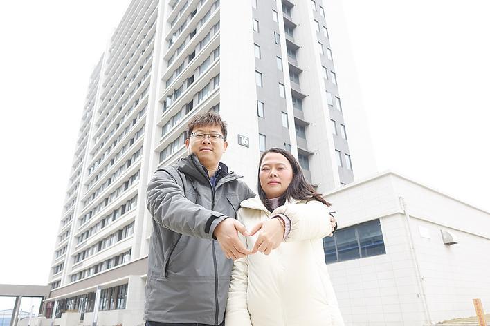 邹祥与妻子卞小亚在员工公寓楼前合影。