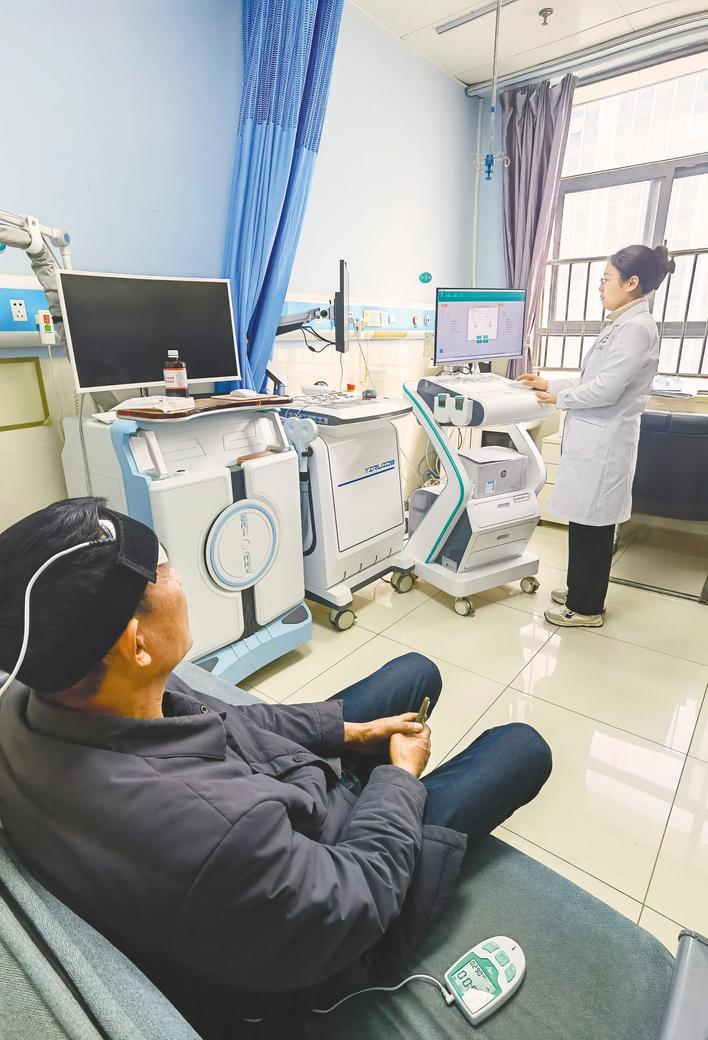 在治疗现场记者看到,顾先生前额一侧由绑带固定一块电刺激贴片,一个手机大小的调控器通过电线与贴片连接,旁边体积更大的经颅电磁刺激治疗仪主机上可查看治疗者各项参数。“单次治疗约40分钟,每20分钟休息一会儿。感觉麻麻的,其他没有任何不适。”顾先生说。