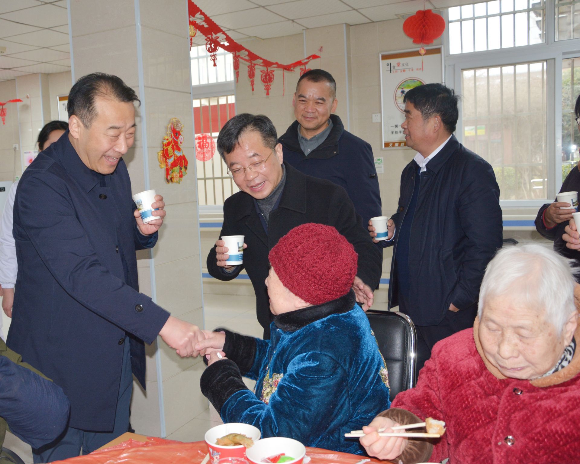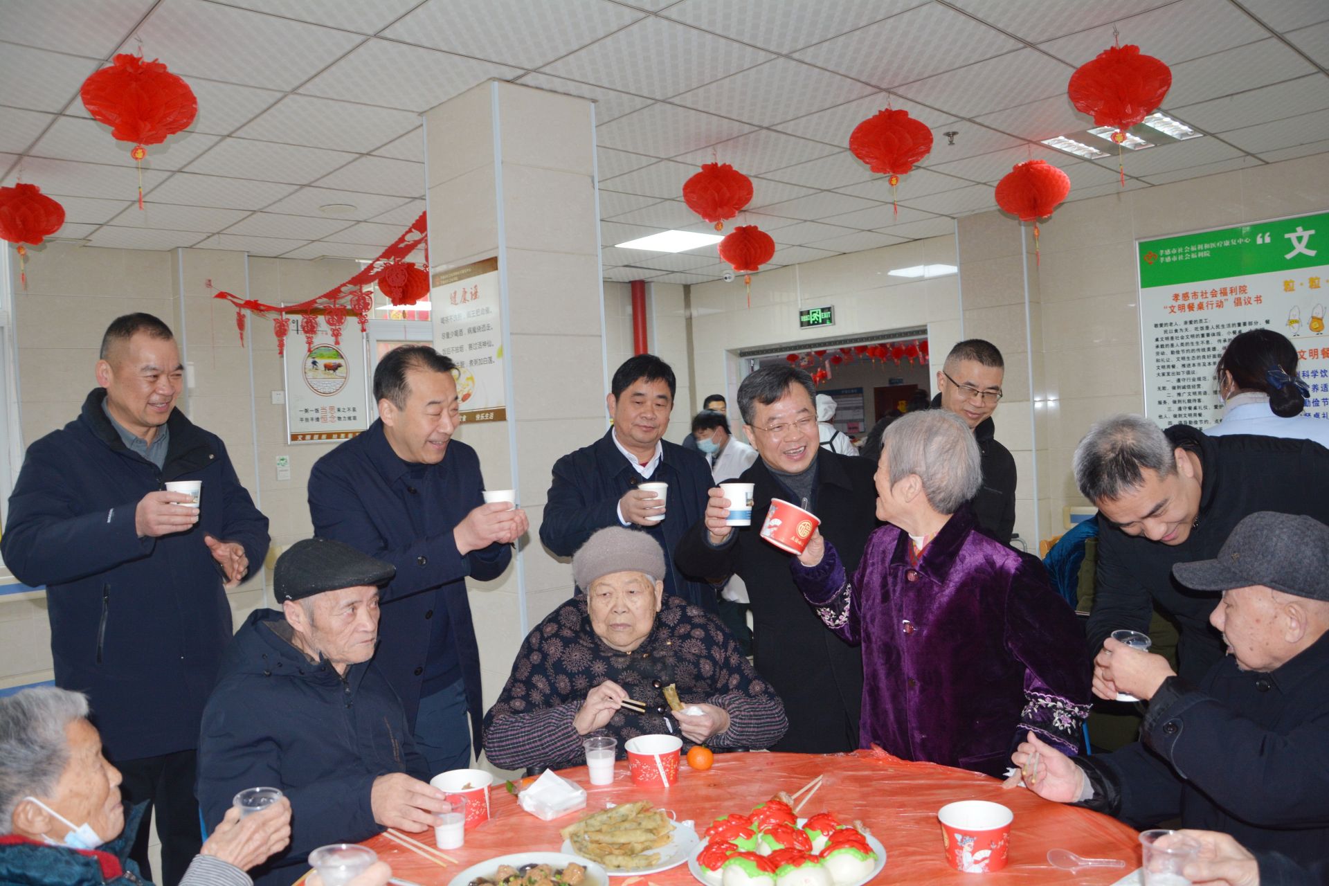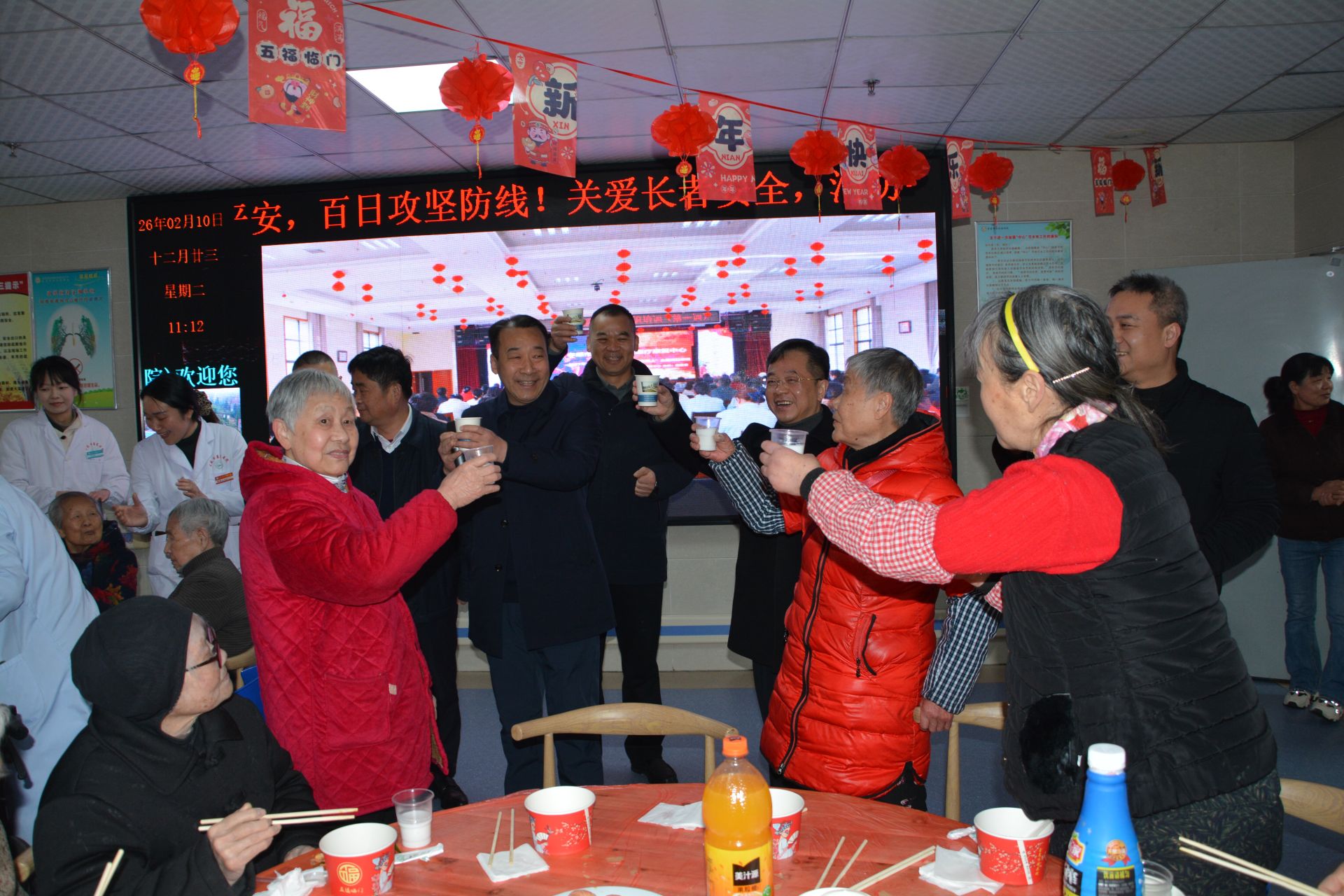 中午,伴随着喜庆的鞭炮音乐,为老人们精心筹备的团年饭正式开席。孝感市社会福利和医疗康复中心党委书记王志农、主任刘晓安率班子成员来到食堂餐厅,以茶代酒向老人们送上新年的祝福,将院内温馨、欢乐、祥和的新春氛围再次推向高潮。