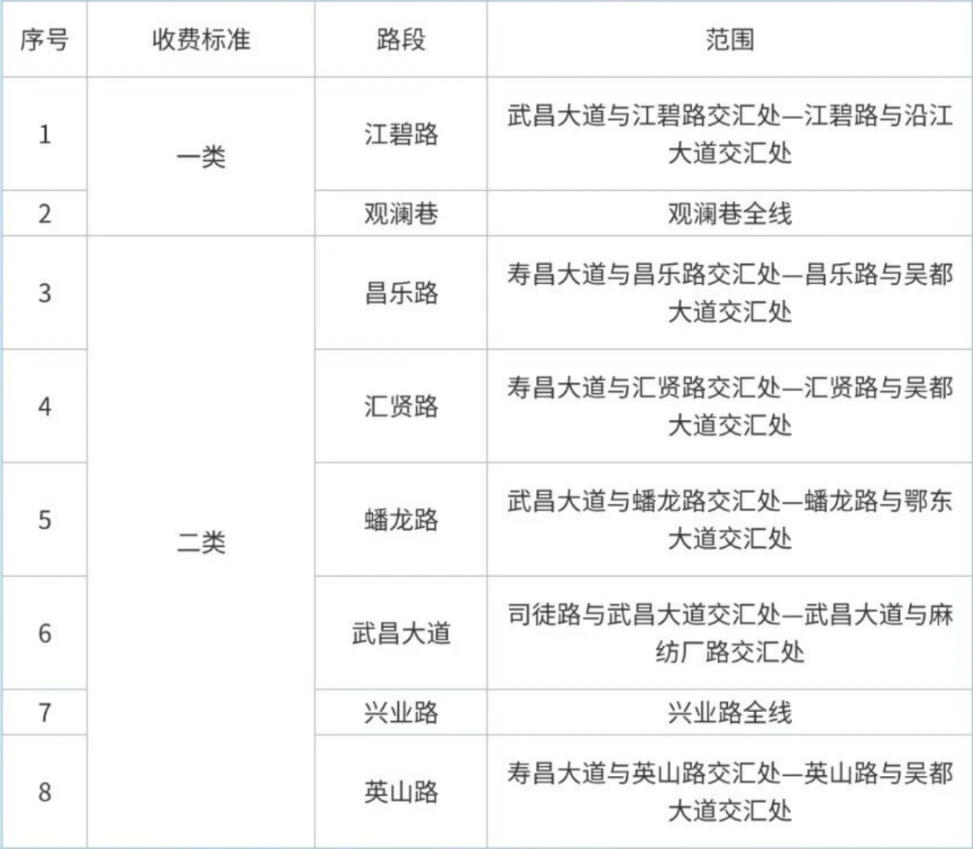 收费时段于当天早上8:00(不含)至晚上20:00(含)。具体收费标准为,一类区:江碧路(武昌大道与江碧路交汇处一江碧路与沿江大道交汇处)、观澜巷(观澜巷全线);停车两小时(含)以内(首半小时免费),每半小时收费1元;停车超过2小时,每半小时收费1.5元。不足半小时,按半小时计算,当天每泊位最高收费不超过20元,大型车按实际占用泊位数计时收费;