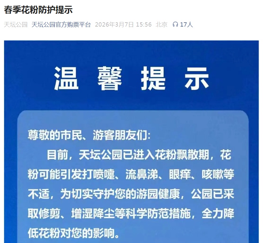 据“北京发布”消息,专家预测3月中旬至4月中旬,为北京春季花粉致敏高峰期。