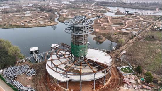 在观鸟塔建设现场,钢构主体已拔地而起,整体完成约70%。这座集科普宣教与观鸟功能于一体的建筑,未来将成为片区内的标志性节点。目前,施工方正对最新版设计方案进行技术交底,进一步优化功能布局。按计划,观鸟塔主体结构将于5月1日前完工,随后转入内部装修阶段,预计10月1日前全面竣工并对外营业。建成后,游客可登塔远眺湿地风光,了解鸟类栖息与生态保护知识。