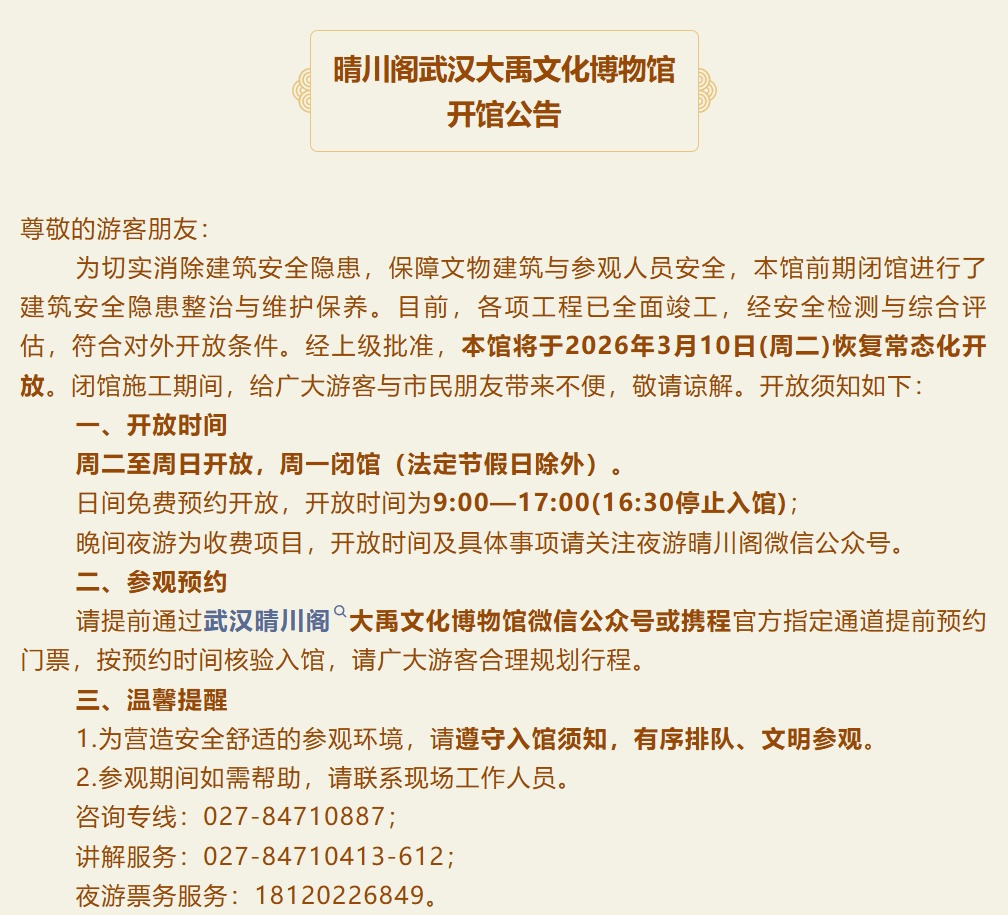 为保障文物建筑与参观人员安全,晴川阁景区自去年11月起开始闭馆修缮保养,对晴川阁主楼及“三楚胜境”屋面和墙面进行维修保养加固。目前,各项工程已全面竣工,经安全检测与综合评估,符合对外开放条件。