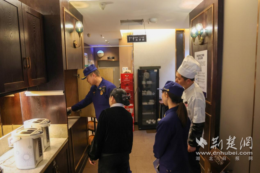 荆门市掇刀区消防监督员深入餐饮场所,对室内消火栓进行随机抽查,并向商户普及如何辨别假冒伪劣消防产品的相关知识。魏欢欢 摄