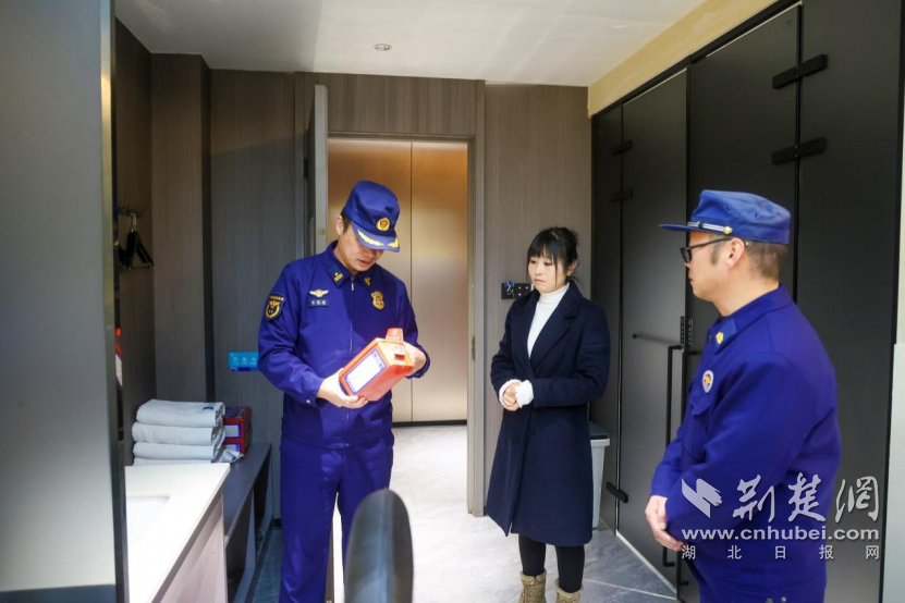 荆门市掇刀区消防监督员深入酒店,对客房内的过滤式消防自救呼吸器进行抽查,并手把手指导工作人员如何辨别产品真伪。魏欢欢 摄