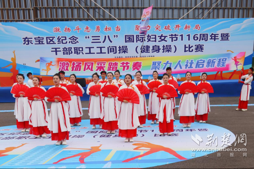 荆楚网(湖北日报网)讯(通讯员 汪鹏鹏 许良 孔亚东)近日,荆门市东宝区纪念“三八”国际妇女节116周年暨干部职工工间操(健身操)比赛圆满落幕,东宝区人社局代表队凭借亮眼表现,从全区24支参赛代表队中脱颖而出,勇夺比赛第一名。