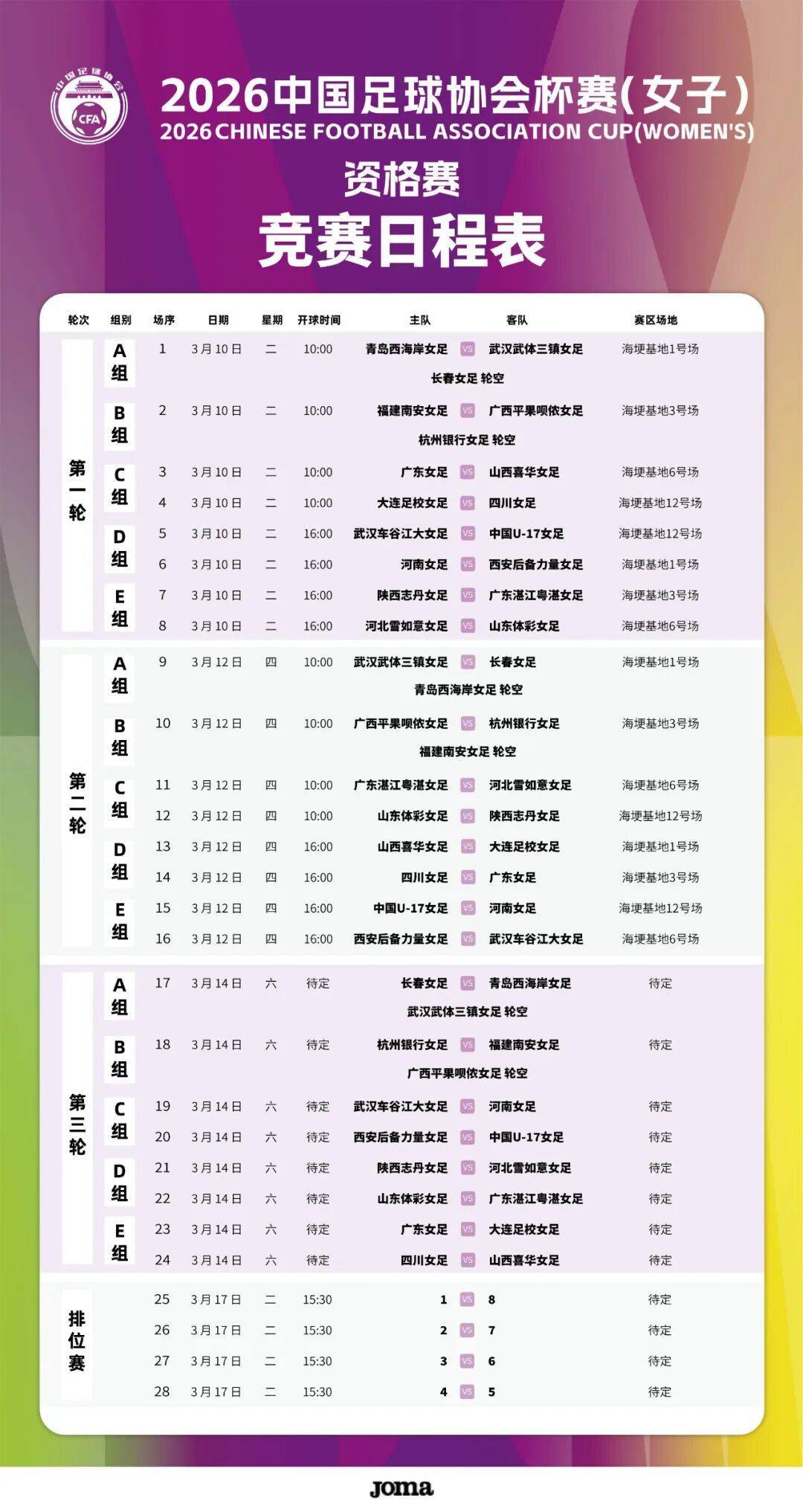 根据2026年全国成年女足竞赛工作计划,女子足协杯资格赛阶段比赛于3月10日至18日进行。