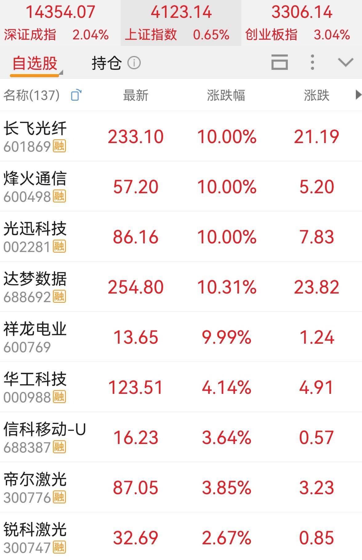 湖北日报讯(记者张真真)3月10日,“光谷板块”迎来涨停潮。长飞光纤、烽火通信、光迅科技、达梦数据、祥龙电业等众多股票涨停,华工科技、信科移动等涨幅在3%以上。