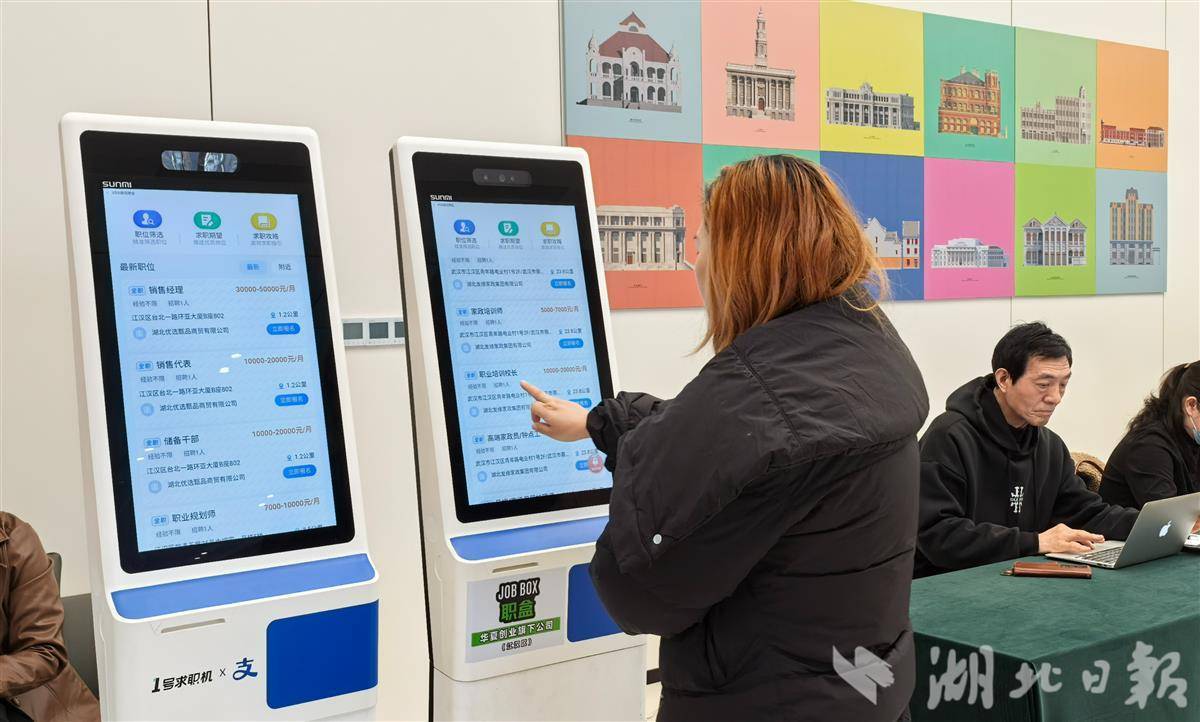 招聘会现场,求职者正在自助求职机上浏览岗位。