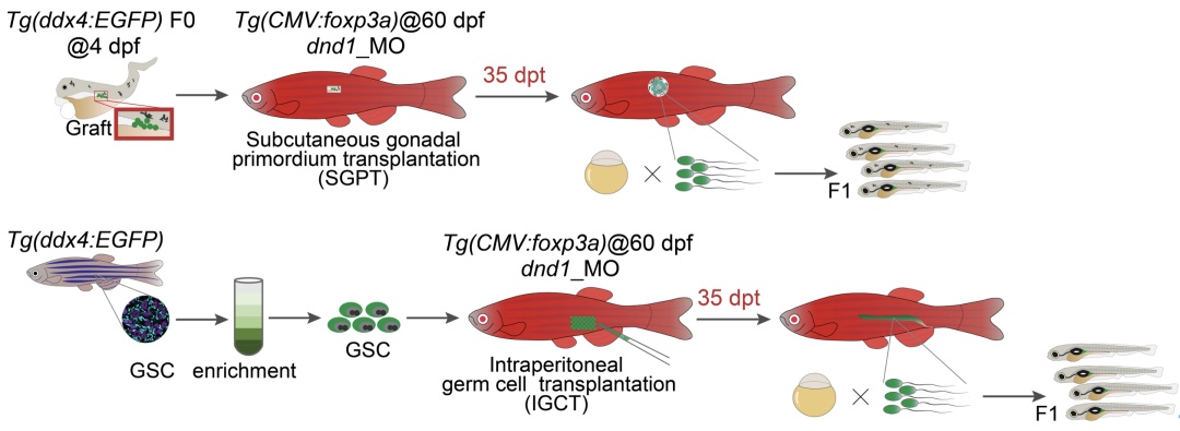 更重要的是,这种免疫耐受斑马鱼并非免疫缺陷,能在普通条件下正常养殖。研究人员用2月龄的该品系斑马鱼做受体,开展皮下性腺原基移植和腹腔生殖干细胞移植,仅用35天,也就是1个月左右,就成功获得了供体来源的转基因子代,比传统方法缩短了2个月时间。