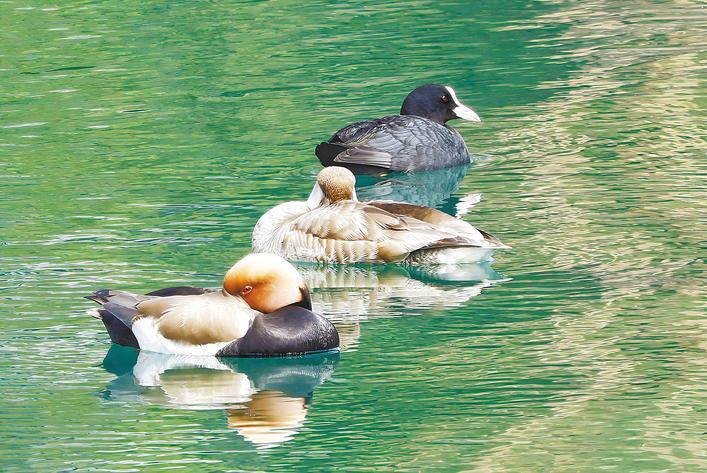赤嘴潜鸭红嘴亮眼,雄鸭浓栗色的头顶缀着淡棕黄色羽冠,褐、白、黑相间的翅膀衬着漂亮尾羽,在碧波中格外夺目,它们时而潜入水中取食,时而静静漂浮在水面梳理羽毛,尽显憨厚灵动本色。