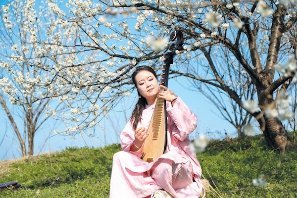 指尖轻触弦柱,似将春日絮语揉进乐声。