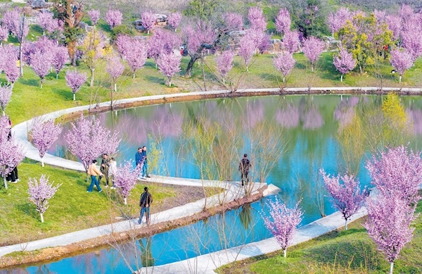 茅箭区秦巴生态植物园内,美人梅如云霞缭绕,与亭台水榭相映成趣。园中,老人拄杖漫步,静享岁月温柔;年轻人铺展野餐垫,畅谈生活乐趣;中年人在花影下翩翩起舞,尽显自在从容。春日的浪漫,更藏在城市街巷之间。城区仁威路两侧,千余株美人梅迎来盛花期,绵延千米的粉色花廊如绸带环绕,深粉花瓣层层叠叠、娇艳动人。行人纷纷驻足欣赏,姑娘们与繁花同框留影,老人牵着孙辈漫步花下……