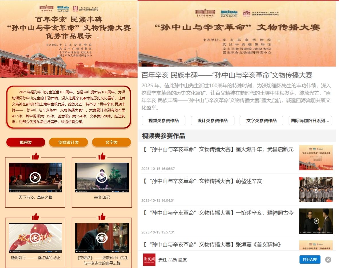 线上展示期间,专题页面累计吸引超110万网友互动点赞,新浪微博话题 #孙中山与辛亥革命文物传播大赛# 阅读量达1136.9万、讨论5515次,全网相关信息超2.8万条,形成“作品展示—网友点赞—二次传播”的良性循环。网友的每一次点击、每一条分享,都让辛亥精神通过网线直达心间,助力革命文物从博物馆展柜走向大众视野。