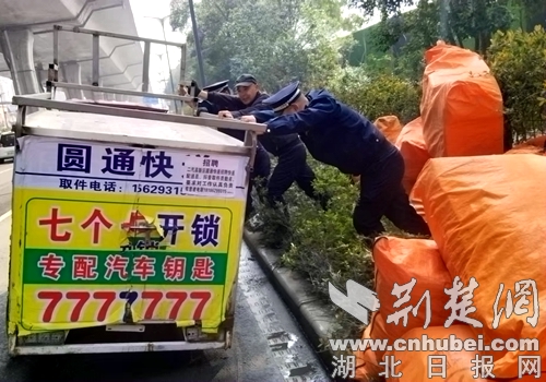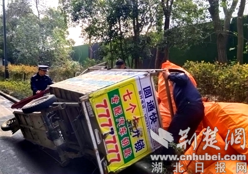 荆楚网(湖北日报网)讯(通讯员 樊帆、肖学清)3月11日上午,襄阳高新区富康大道发生一起交通意外:一辆圆通快递车侧翻在道路绿化带。正在此处开展市容巡查的城管队员肖学清、刘波、徐小强立即上前处置。
