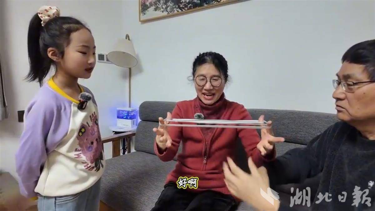 有的家庭,让旧时光在新世代中“复活”。五(4)班唐哲宇一家五口围坐灯下,奶奶握着孙子的手穿针引线缝扣子,爷爷在一旁含笑注视:“我们五个人在一起,真开心。”二(4)班熊彦琪和奶奶翻起了花绳,棉线在指间变幻出“面条”“梯子”“渔网”——那些80后父母童年的游戏,在祖孙的掌心重新拥有了生命。