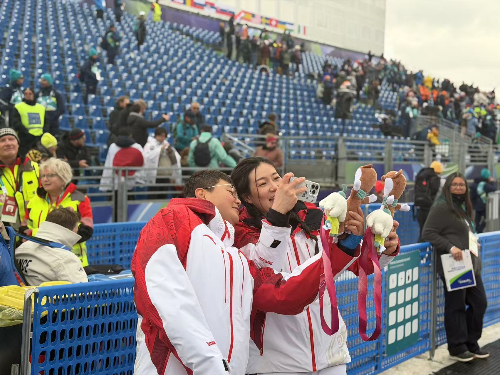 当地时间3月10日,中国选手刘思彤(右)获得米兰—科尔蒂纳冬残奥会高山滑雪女子超级全能坐姿组铜牌。 本报记者陶相安 摄