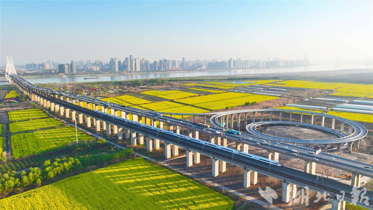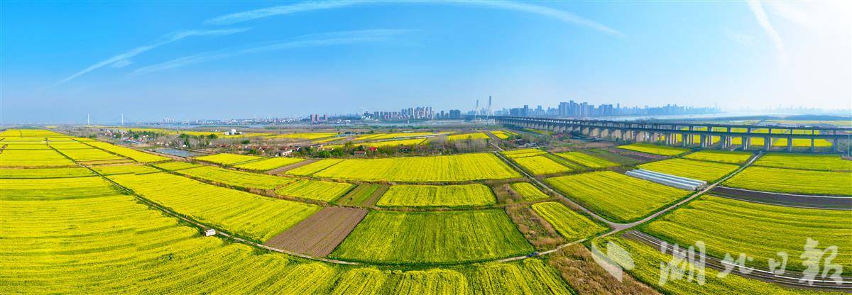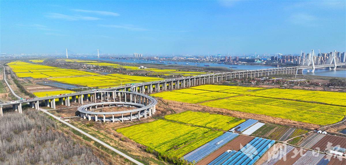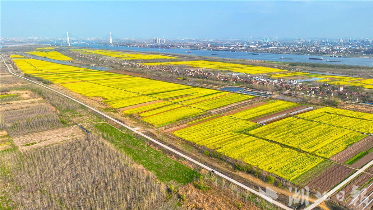 阳春三月,春风执笔,油菜泼金,天兴洲上成片的油菜花怒放。天兴洲,是长江武汉段的一个江心洲,具有得天独厚的原生态江岛风情景观资源。近年来,武汉市洪山区天兴乡积极探索土地流转新模式,激活沉睡的土地资源,在天兴洲大规模种植油菜。春天,成片怒放的油菜花如金毯铺展,似云绵流霞,与天兴洲长江大桥、青山长江大桥及构成一道美丽的风景。(视界网 张兵 摄)