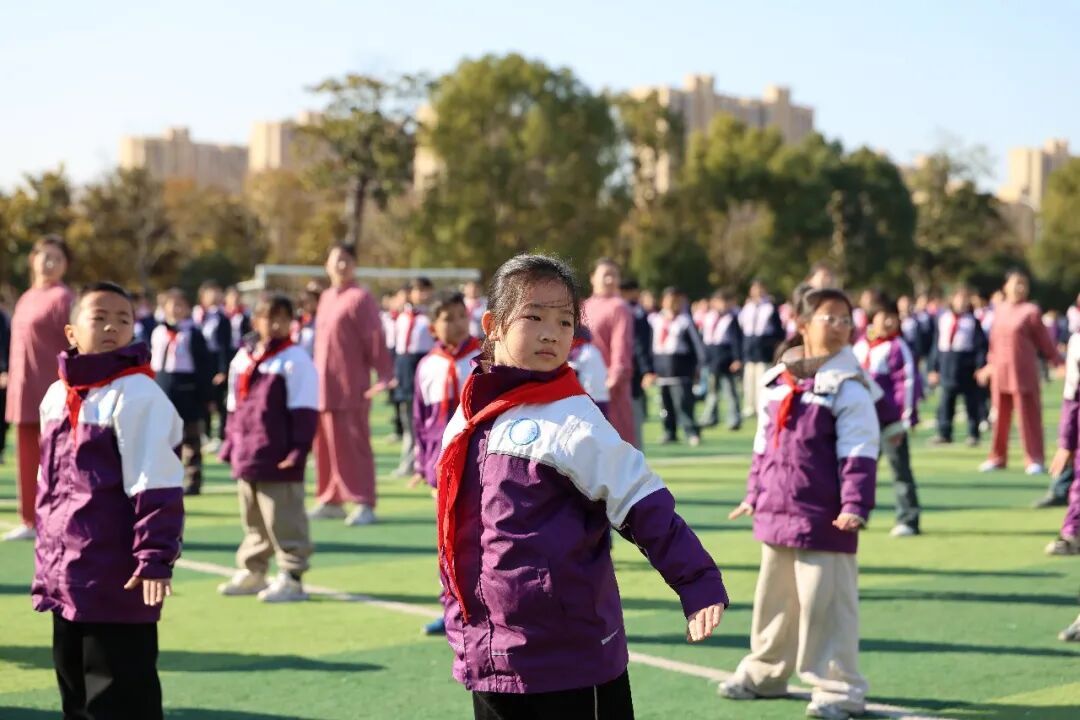 在江苏淮安市洪泽湖实验小学,学生在练习八段锦。殷潮摄