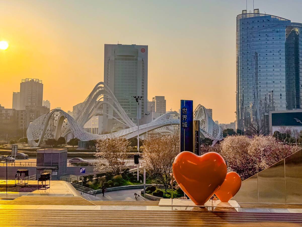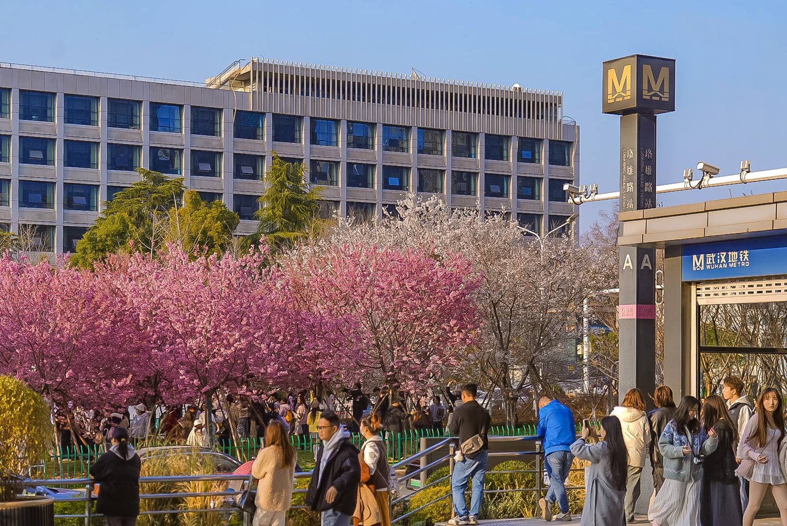 夕阳下,武汉地铁2号线光谷广场站外的樱花树氛围感十足