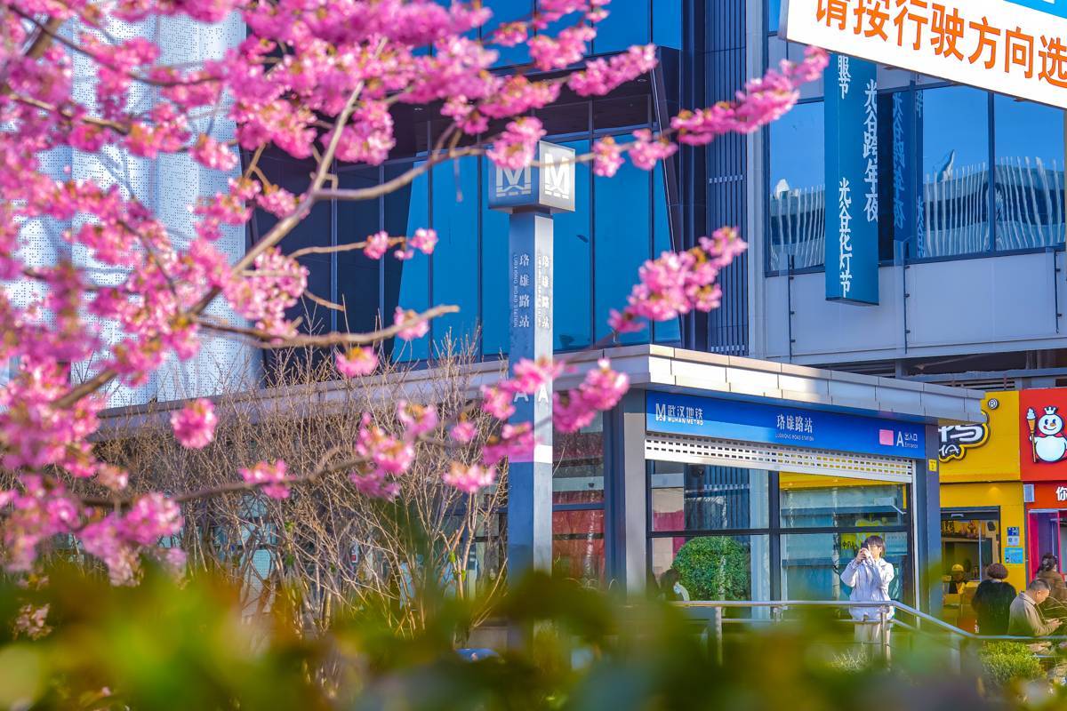 图为珞雄路站周边的早樱迎来盛花期。