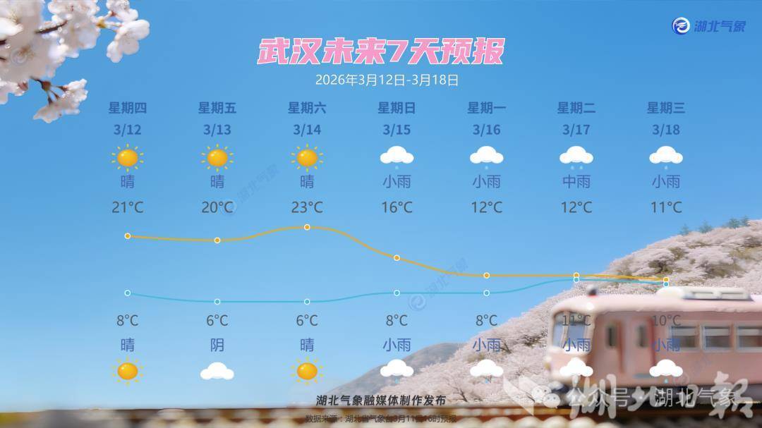 湖北日报讯(记者曾莉)3月11日,湖北大部地区阳光在线,15时气温突破20℃,兴山和鹤峰气温突破25℃,武汉气温21.6℃。不过,冷空气要来了。根据中央气象台预报,11日起较强冷空气开始影响我国,14日起开始影响湖北,届时将转为持续阴雨天气。